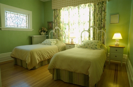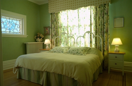 The large sunfilled room is situated on the first floor, no stairs! The floral comforters enhance the colours of the leaded stain glass window. This bright room offers twin beds or one king and an ensuite shower with seat.